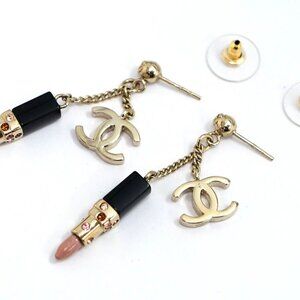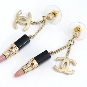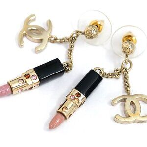 CHANEL CC Logos Rhinestone Dangle Lipstick Charm Earrings Gold Tone 08A Auth