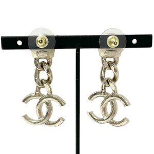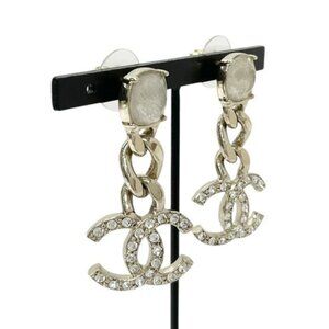 CHANEL CC Logos Rhinestone Dangle Stud Earrings Gold Tone C23C Auth