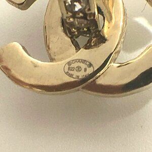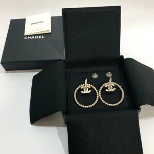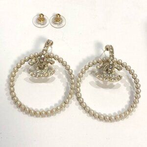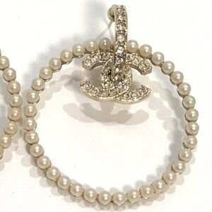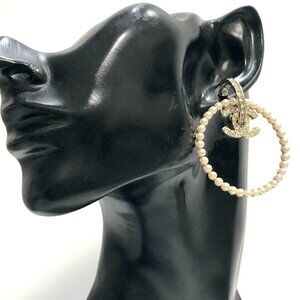 CHANEL CC Logos Rhinestone Pearl Circle Hoop Stud Earrings Gold Tone