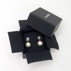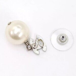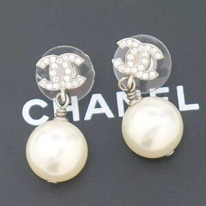 CHANEL CC Logos Rhinestone Pearl Drop Stud Earrings Silver Tone A20V Auth w/Box