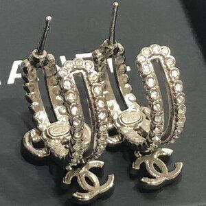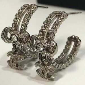 CHANEL CC Logos Rhinestone Ribbon Hoop Stud Earrings Silver Tone A22B Auth
