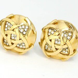 CHANEL CC Logos Rhinestone Round Clip-On Earrings Gold Tone 23 Auth w/Box q11447