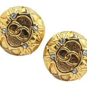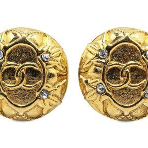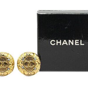 CHANEL CC Logos Rhinestone Round Clip-On Earrings Gold Tone Auth w/Box #67691