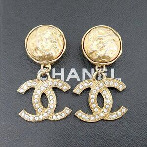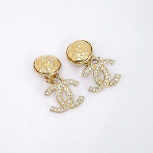 CHANEL CC Logos Rhinestone Round Drop Earrings Gold Tone Auth