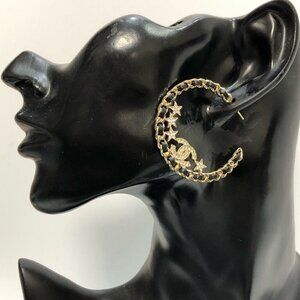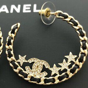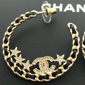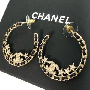 CHANEL CC Logos Rhinestone Star Leather Hoop Earrings Gold Tone B23C Auth