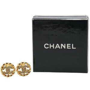 CHANEL CC Logos Rhinestone Twist Circle Clip-On Earrings Gold Tone Auth w/Box