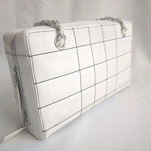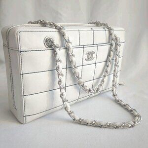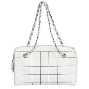 This is an authentic CHANEL Surprique East & West Vintage Quilted Lambskin Leather Wild Stitch CC Tote Bowler Shoulder Hand Bag in White Ivory. This bowler bag is crafted of lambskin leather. It features a gold CC logo at the front and lambskin leather straps. This Chanel Top Handle Bag features the wild stitch iconic plaid print and Silver Hardware. Zip Closure at Top. Serial Sticker intact.