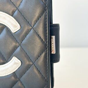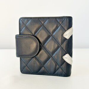 CHANEL Calfskin Quilted Cambon Bifold Wallet. The wallet is crafted of black diamond quilted calfskin leather with a white Chanel CC patch. The wallet opens with a strap to a black leather interior lined with card slots, patch pockets for bills and a kiss lock opening on the reverse that opens to a currency compartment.