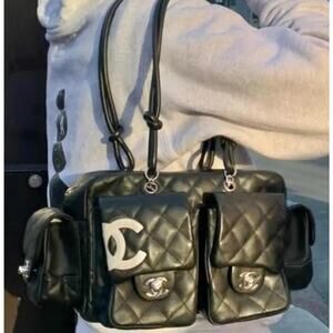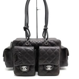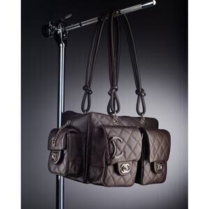 This authentic Chanel Cambon Multipocket Reporter Bag is a chic and stylish find! Crafted from brown diamond quilted lambskin leather, it features dual leather-rolled knotted handles and a bold brown patent CC logo.