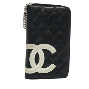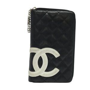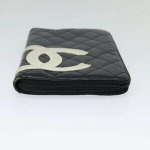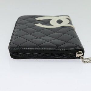 CHANEL Cambon Line Long Wallet Leather Black Silver CC Auth 123622