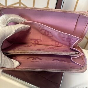 Calfskin Cambon Zip Around travel Organizer Wallet Pink. Barbie Chanel pink wallet cambon model. Wallet in very good general condition. Large wallet with multiple card slots and pockets. Place for a pen. Also place to put the checkbook or passport