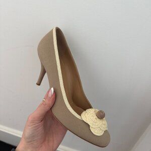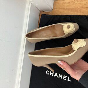 CHANEL Canvas Pumps In Tan Camellia Flower On Vamp Cone Heels