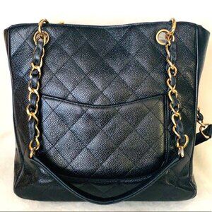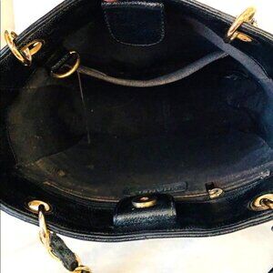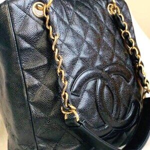 This stylish tote bag is crafted of diamond quilted caviar leather in black. This shoulder bag features a rear patch pocket, large Chanel CC on the face, and polished gold chain link shoulder straps threaded with leather and a shoulder pad. The top opens to a spacious black fabric interior with zipper and patch pockets. Interior has make up stains, some wrinkles and wear of the exterior. Caviar leather is extremely durable and looks great. This tote has a look of timelessness for everyday wear. The tag where the striker with the serial number is still preserved (shown in the pictures) but sticker itself is long ago missing