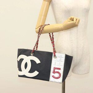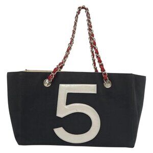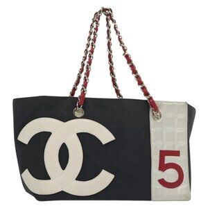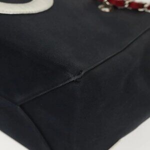 CHANEL Choco Bar Chain Tote Bag No5 Canvas Navy Silver CC Auth 139354