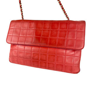 This handbag features a purple and orange square quilted lambskin leather on the exterior and purple and orange satin interior lining. Gold tone hardware, interwoven chain link shoulder strap, turnlock and magnetic closure. Can be used as shoulder bag or clutch.