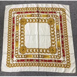 CHANEL Coco Mark Ivory x Multicolor Chain Pattern Silk Scarf /Stole