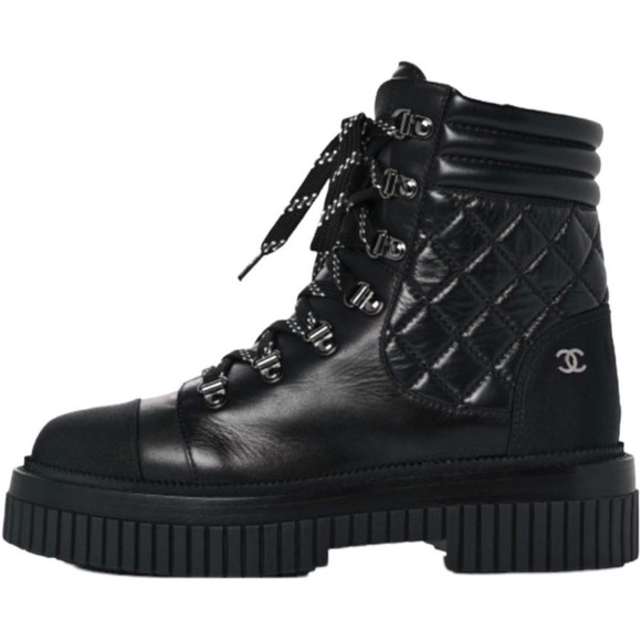 Elevate your shoe game with these exquisite CHANEL combat ankle boots. The sleek black leather upper and quilted pattern make a chic statement, while the almond toe and lace-up closure add a touch of sophistication perfect for any occasion. The low block heel provides comfort and stability, making these boots ideal for travel, workwear, and casual outings.
