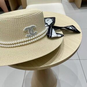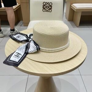 Chic straw hat by CHANEL. Features a stylish black and white ribbon. Perfect for adding elegance to any look.