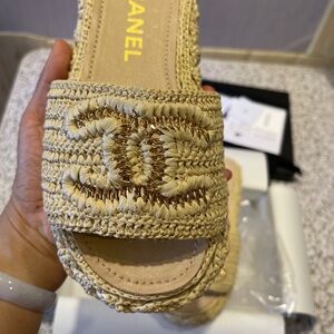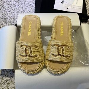 Stylish CHANEL slip-on sandals with a woven texture. Features cream tones and signature branding.