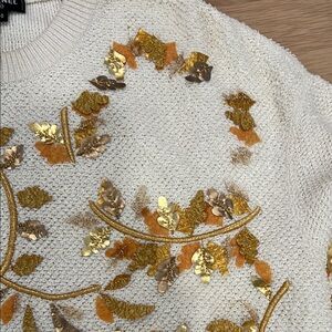 Elegant crew neck sweater with gold embellishments. Features intricate floral designs. Perfect for a chic look.
