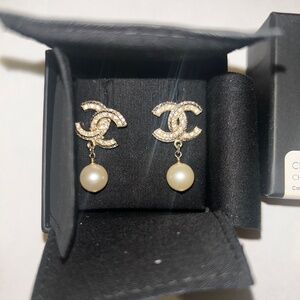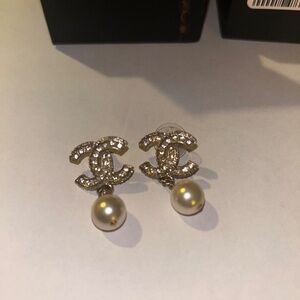 CHANEL Crystal Pearl CC Drop Earrings Gold
