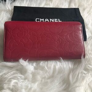 Vibrant deep red leather with sleek silver accent. Features CHANEL logo.