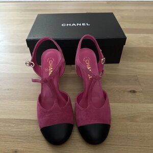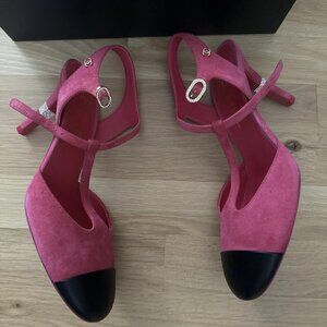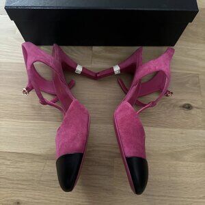 Absolutely gorgeous Chanel round toed open shoes. Heels have shiny crystal detail. CC has silver crystal detail on side . Fuchsia suede with lamb skin toe. So many special Chanel details. Brand new inbox, never worn. retails for $1350.