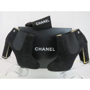 CHANEL G31660 BLACK SUEDE GOLD LOGO CHELSEA HEEL SHORT ANKLE BOOTIES PUMPS 37