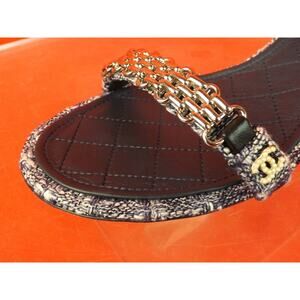 NAVY BLUE/DARK GRAY TWEED THICK GOLD TONE CHAIN CC PEARL LOGO SANDALS PUMPS