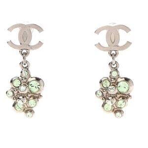 CHANEL GREEN Crystal CC Drop Earrings*Silver & Green*Velvet Gift Box*PIERCED