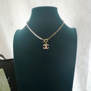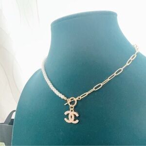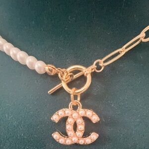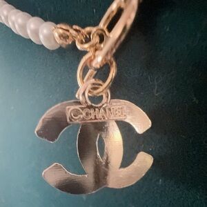 Authentic CHANEL charm on gold plated chain with white pearls. Features iconic logo charm.