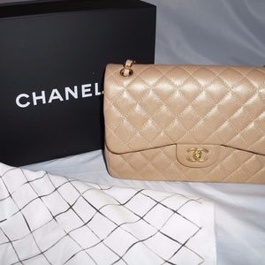 Rare gorgeous sandy metallic gold issued maybe every 10 years) authentic caviar double flap Chanel purse, in excellent used condition worn twice and never touched the floor. Comes with full set dust bag, authenticity card, booklet,original box, ribbon,camilla flower, and receipt.