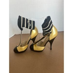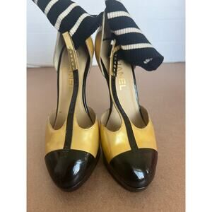 CHANEL Gold/Yellow/Black Patent Leather T-Strap Ankle Sock Platform Pumps Sz 5.5