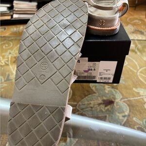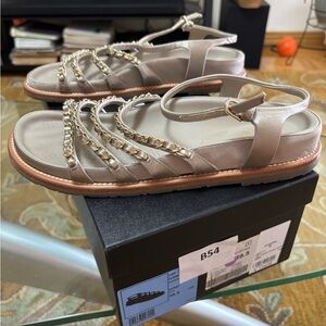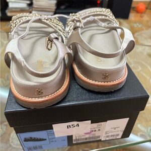 Step into elegance with these CHANEL gray sandals, featuring intricately braided straps that offer a chic and sophisticated look. Designed with a flat sole and a secure ankle strap, these sandals provide both comfort and style for any occasion. The subtle shimmer of the straps adds a touch of glamour, making them a versatile addition to your summer wardrobe.