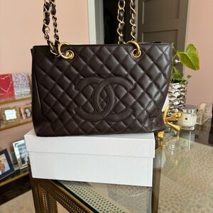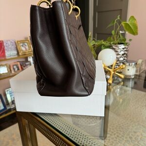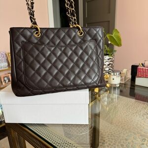 Timeless elegance meets functional luxury with this classic Chanel handbag, crafted from rich brown pebbled calfskin leather in a signature quilted stitch design. The gold-tone Chanel chain-link detail is perfectly paired with brown leather handles, offering a chic contrast and comfortable carry.