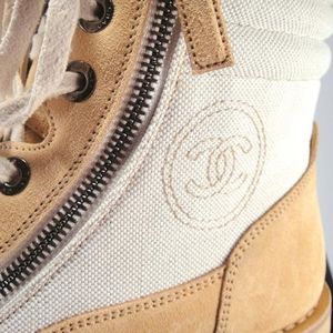 CHANEL Hiking Timberland Suede and White CC Canvas Boots