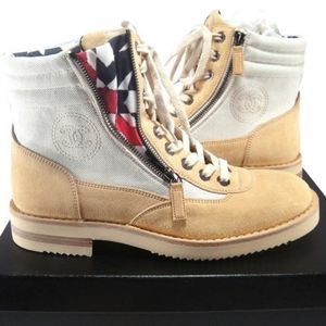Worn once. Timberland-style hiking boot. Made from canvas and suede, they are beautified with lace-ups, zippers on both sides, and the signature CC logo. They are elevated on low heels and are complete with sturdy soles for maximum comfort. Great condition.