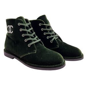 CHANEL Interlocking CC Logo Velvet Lace-Up Boots EU 38 US 8 Green Ankle Booties