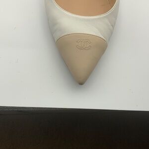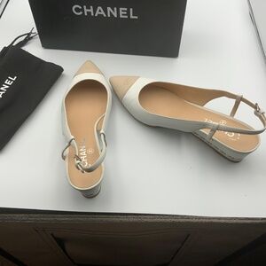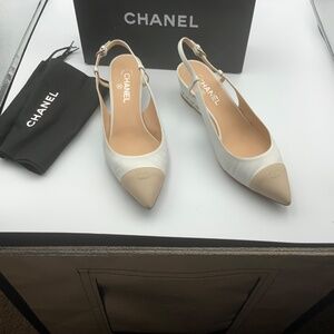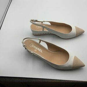 White and tan slingback with embellished wedge heel. Logo on toe box. 2 dust bags. In box