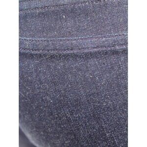 Dark wash blue Chanel low-rise skinny jeans featuring five pockets, tonal stitching throughout, braided trim at waist and concealed zip closure at front.
