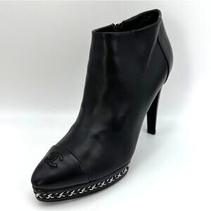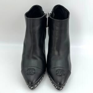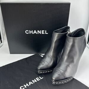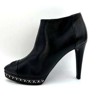 CHANEL Lambskin CC Cap Toe Chain Platform Heel Boots 38.5 Black