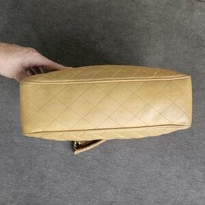 Up for grabs is a stunning Chanel lambskin tote bag with beautiful two leather and gold chain-link shoulder straps. Excellent size allows this piece to be a great outing bag. Extra security with the added flap tab to close bag. Lambskin on chain allows for maximum comfort all day. Crafted with 24k gold hardware.main compartment and 2
