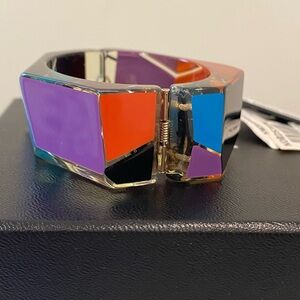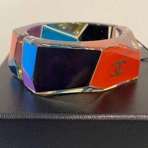 CHANEL asymmetrical faceted lucite bangle bracelet with orange, purple, blue and black panels and metallic CC logos. One size with hinge opening. Inner circumference measures 6 1/8” New with tags in original box.