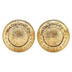 CHANEL Logo Round Vintage Clip-On Earrings Gold Tone Auth #07882
