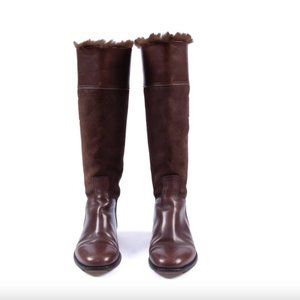 Fur lined leather and suede boots with embossed logo. Zip back. Slight heel. Knee/tall length, riding boots. SUPER soft fur inside.