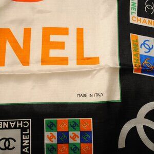 CHANEL MULTICOLORED SILK SCARF MADE IN ITALY. LARGE CHANEL LOGO IN MIDDLE W/ SMALLED ONES AND "CC" AROUND BORDER. USED ONCE OR TWICE, NO VISIBLE FLAWS