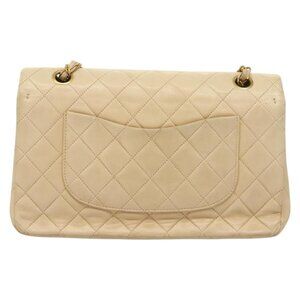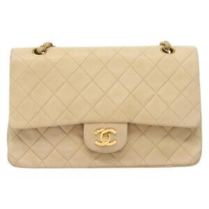 CHANEL Matelasse 25 Double Flap Chain Bag Lamb Skin Beige Gold CC Auth
