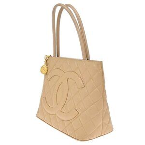 CHANEL Medallion Matelasse Shoulder Bag Grained Calfskin Leather Beige