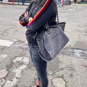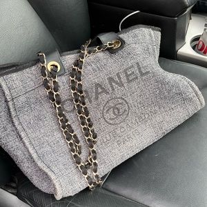 Gorgeous classic gray tweed with gold toned hardware Deauville in medium size. Black leather handles and gold hardware with fabric shoulder handles. An absolute stunner - easy to carry, lightweight, and yet rich tweed feels luxurious. Gently used, some wear to the corners (see photos). Selling for over $5k on other resale sites!