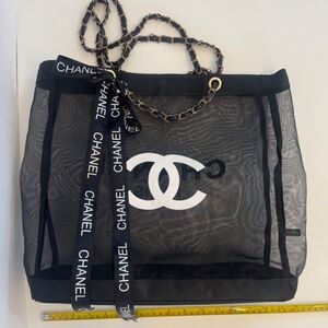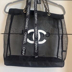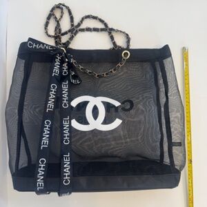 CHANEL Black mesh tote and cosmetic case promotional gift bag.
